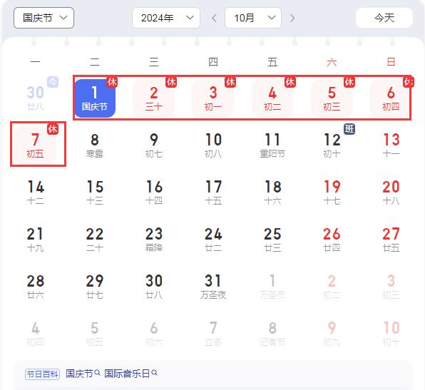 2024年國慶節(jié)放假時(shí)間安排: 10月1日(星期二)至10月7日(星期一)放假調(diào)休,共七天。10月8日(星期二)上班。