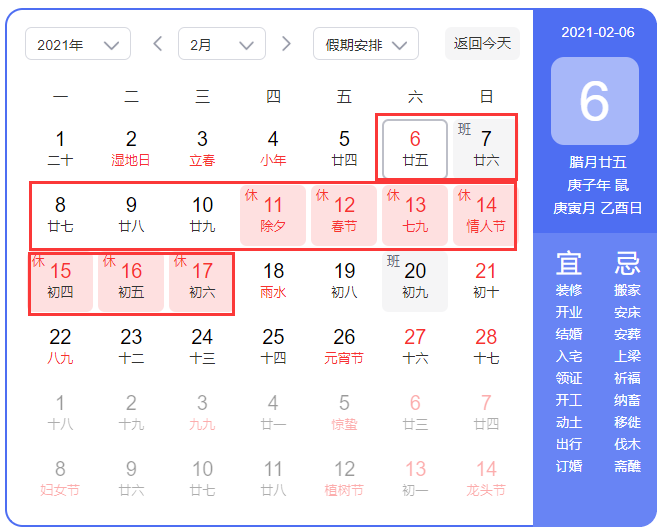 2月6日(星期六)至2月17日(星期三)放假,共12天。2月18日(星期四)上班。